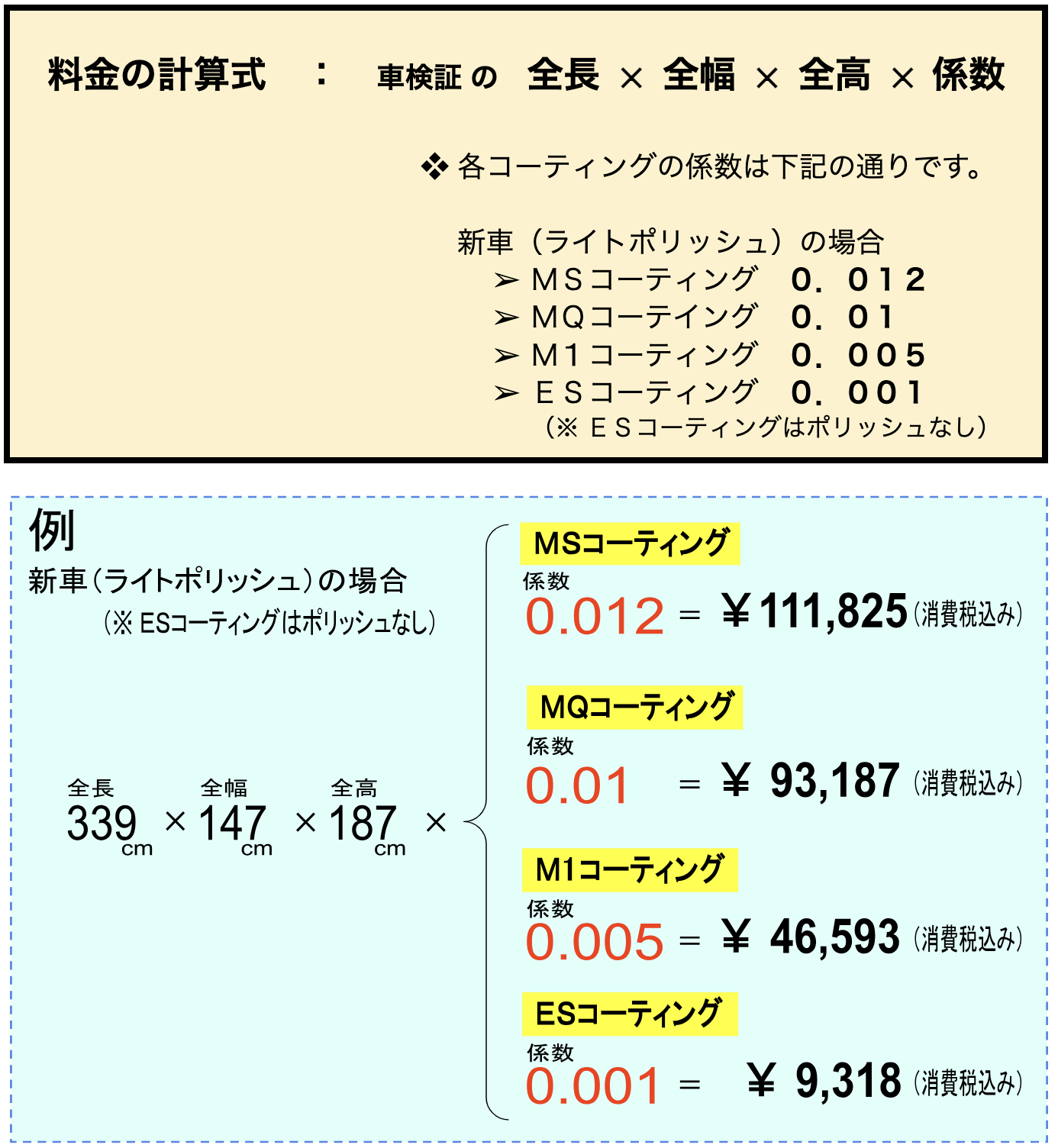 車検証の全長、全幅、全高に当社コーティングメニューごとの係数を乗じて計算しています。尚、車高の変更やエアロパーツ取付などで全長、全幅、全高が変わっている場合は当社にて実測して計算します。